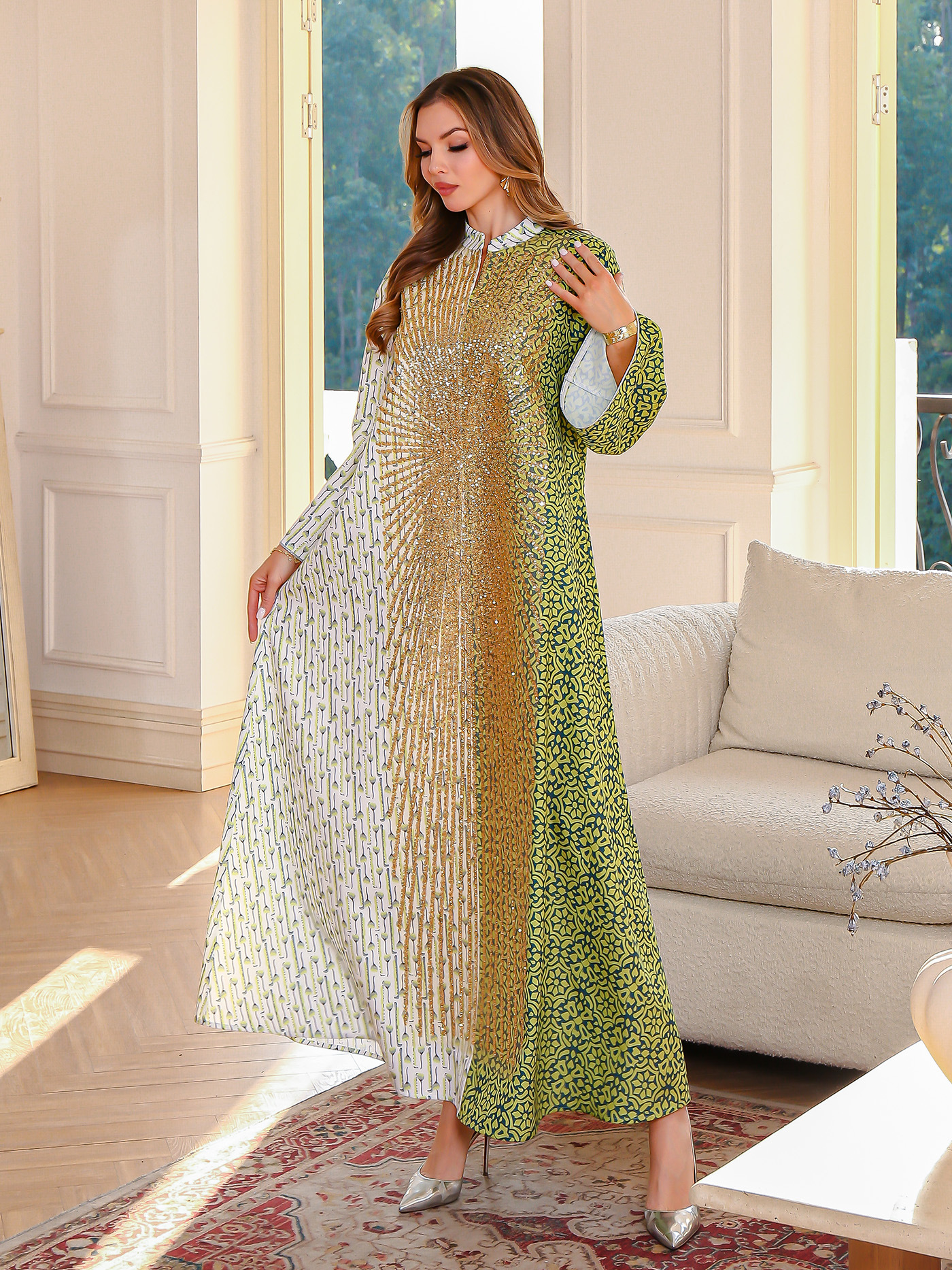 Summer Muslim Spliced Beaded Long Robe Middle Eastern Dubai Abaya Printed Maxi Dress